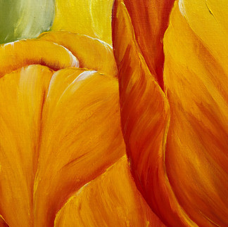 Bovenstaand tulpenschilderij 'Symphony of Spring' (60 x 180 cm, acryl op linnen) is beschikbaar! Dit schilderij heb ik wel vanuit een schets opgebouwd. De uitdaging om deze tulpen levendig te krijgen zit in de kleurspanning van licht en donker. Zoals bijvoorbeeld de oranje roos: om deze rond te krijgen moet de onderkant donker oranje en de bovenkant licht oranje in verschillende kleurschakeringen oranje. Om daarvoor de juiste levendige kleurnuance te krijgen, voeg ik aan de onderkant meer rood aan het geel toe en aan de bovenkant meer geel en wit aan het rood. En wel zo dat het toch oranje blijft. Want ik gebruik niet oranje als kleur verf maar de combinatie geel en rood. Ook wilde ik de randen van de bloembladen voldoende duidelijk aangeven. Dat doe ik dan door die dik in de verf te zetten: ik neem veel verf op mijn penseel en duw de verf er op de rand 'uit' en strijk de rest van de verf met de richting van het bloemblad mee zonder de eerste aanzet mee te nemen.